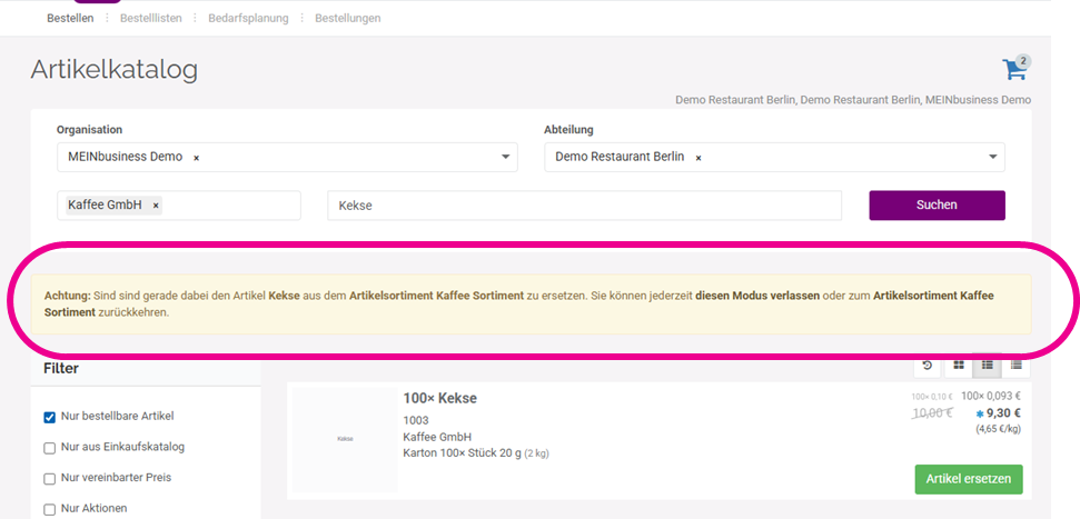 Wenn du auf "Artikel ersetzen" klickt, kommst du in die Ansicht des Artikelkataloges und kannst den nicht verfügbaren Artikel durch einen gewünschten/vorgegebenen Ersatzartikel austauschen.