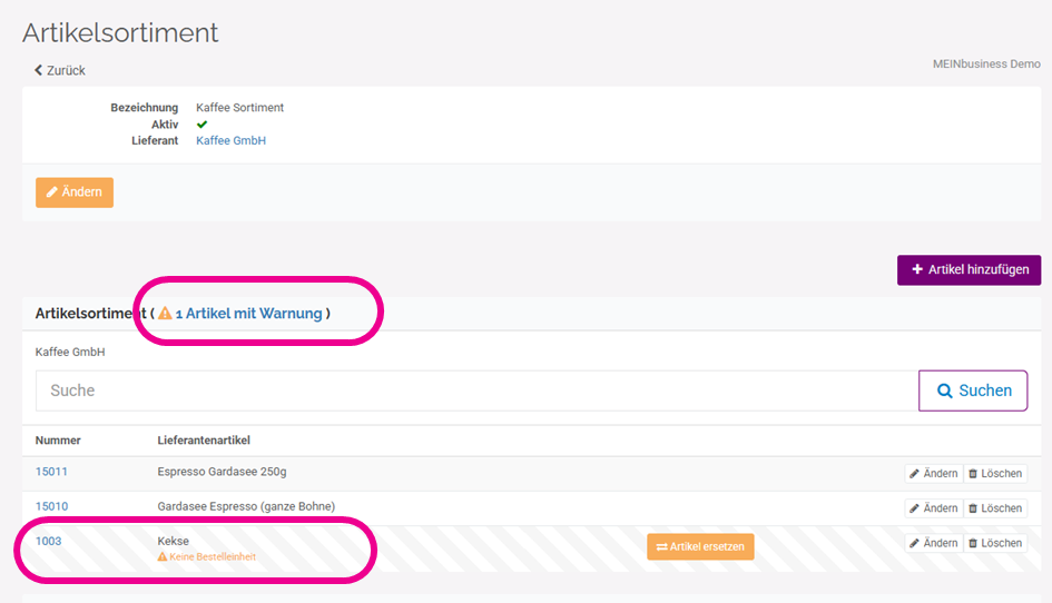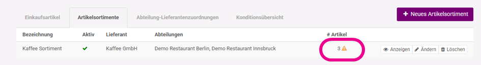 Wenn du eines der Sortimente öffnest, siehst du erneut wie viele Artikel mit Warnungen gekennzeichnet werden und kannst dir anzeigen lassen, welche genau betroffen sind: