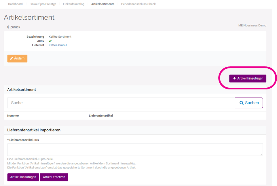 Du kannst in der Ansicht des Artikelsortiments anhand des Buttons “+ Artikel hinzufügen” eine Ergänzung vornehmen: